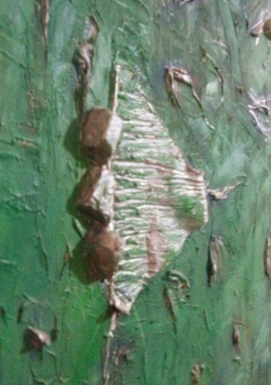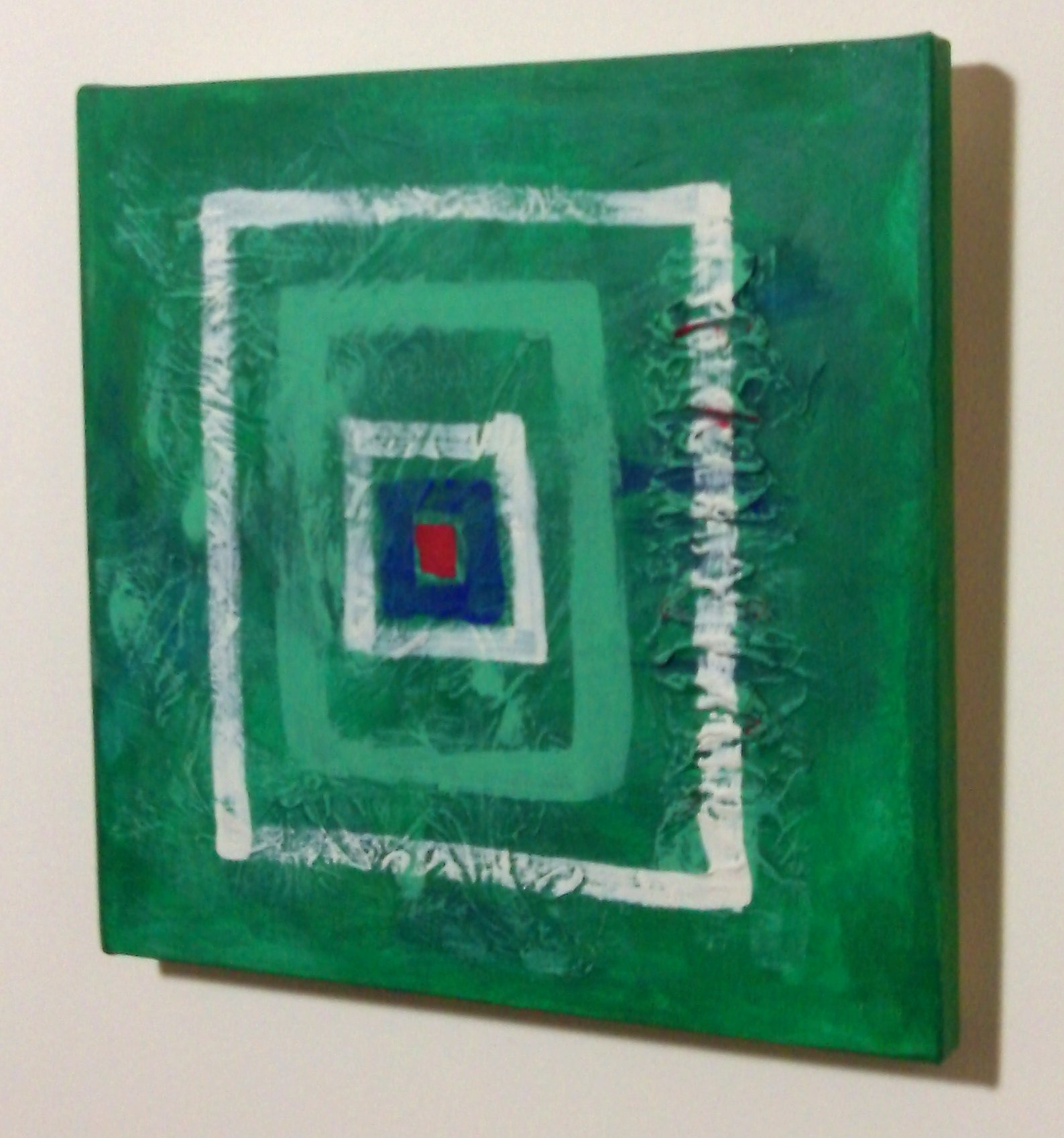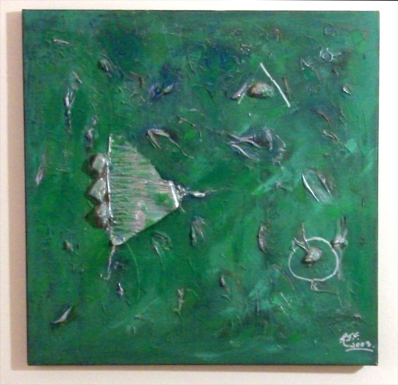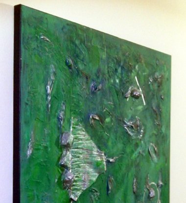 “Deep in the Green” “Deep in the Green” was painted during the intense spring of 2003. Nature had exploded with life, and though the mossy green foliage had covered just about everything, the remains of an old tin roof from a long abandoned shack in the woods was the inspiration for this unusual and interesting expressionist painting. Areas of the painting protrude noticeably from the canvas, endlessly provoking the viewers imagination. “Simply Stunning” says the owner. (Measures 24″ x 24″)