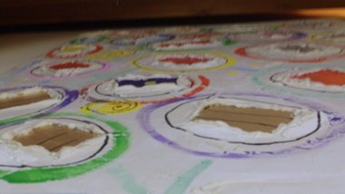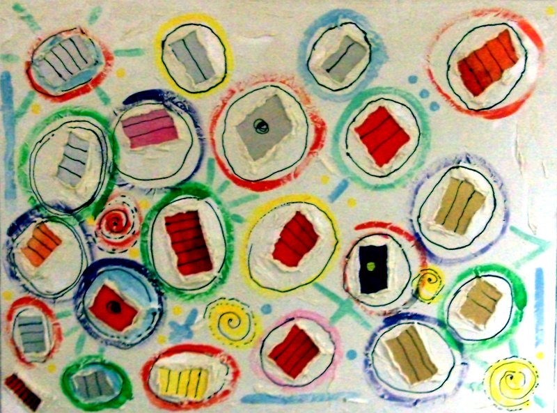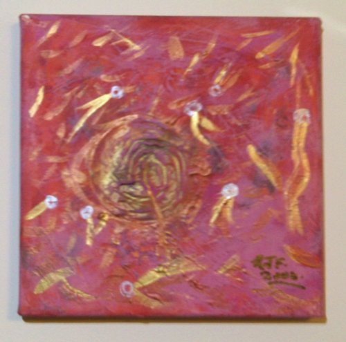 “Shamanic Journey” – A small acrylic painting (10″ x 10″) created in 2004. The continuation of a deeply introspective time in RjF’s life. The continued search for meaning, search for answers, and search for relevance and direction led to the exploration of certain native spiritual practices. “Shamanic Journey” is another painting, capturing the essence of that time in her life.